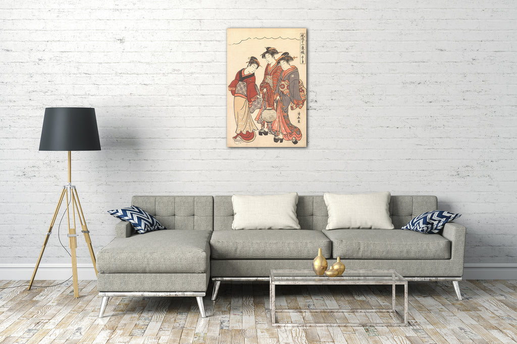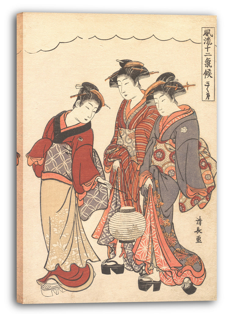 Leinwandbild Torii Kiyonaga - Zwei Geisha hinter einem Mädchen, das eine Laterne trägt